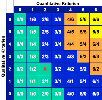 Verbreitet sind Verfahren, bei denen die Mitarbeitenden in 4x4- oder 6x6-Matrizen markiert werden, in denen die zu einer Punktzahl zusammengerechnete Zielerreichung auf einer Achse Quantität vs. Qualität eingetragen wird. Als „Champion“ befindet man sich dann rechts oben in der Matrix, und links unten ist man „Low Performer“ oder etwas vornehmer ausgedrückt: man hat noch Potenzial.