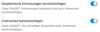 Chatverläufe: Man kann - zumindest bei der Bezahlversion - die Berücksichtigung von seinen vergangenen Chatverläufen ein- und ausschalten. Der Default ist natürlich eingeschaltet, wie bei allen auf das Datensammeln versessenen Anbietern. Die Folge ist, dass für die Erzeugung zukünftiger Antworten auch die Inhalte der bisherigen Chatverläufe berücksichtigt, d.h. als erweitertes Kontextfenster behandelt werden.