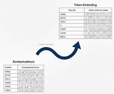 Zweiter Schritt ist das Embedding-Lookup: Für jedes Token des Inputs wird in der Token-Embedding-Tabelle nachgeschaut, welche Werte die Dimensionen des Token haben. Es wird eine neue Matrix, also eine Tabelle erzeugt, in der jedem Token des Inputs aus dem Kontextfenster die aus der Token-Embedding-Matrix gelesenen Werte für die Dimensionen zugewiesen werden. In der Literatur gibt es ein Wirrwarr für die Bezeichnung dieser Matrix (Embedding Output, Input-Embedding oder Imput Embedding Matrix), wir nennen sie einfach Kontext-Matrix. Sie existiert nur temporär im Computersystem, verschwindet wieder, wenn das Benutzeranliegen befriedigt ist und sollte nicht verwechselt werden mit der immer konstanten Token-Embedding-Matrix. Jedes Eingabe-Token hat damit einen Bedeutungs-Vektor, der erst einmal nur die aus dem Training des Systems erworbenen Werte für seine Dimensionen hat und noch so gut wie nichts über seinen Kontekt in der Benutzeranfrage „weiß“.