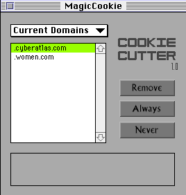 Cookies, die von Web-Servern mit dem angezeigten String in ihrem Pfadnamen kommen (z.B. in der nebenstehenden Abbildung vom Server www.cyberatlas.com), werden entsprechend ihrem Eintrag in einer der drei Gruppen behandelt: immer automatisch entfernt, nie entfernt oder nicht weiter behandelt; schließlich kann man sie jederzeit mit Hilfe des kleinen Programms löschen.Und der Absender erhält keinerlei Messages zurück.