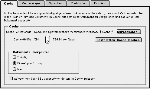 - Beim Aufruf einer Internet-Adresse (URL) schaut das Programm des Benutzers (Browser) zunächst im Cache des Benutzers, ob die abgeforderte Seite dort vorhanden ist. Wird die gesuchte Seite dort gefunden, so wird sie in den Browser geladen und dem Benutzer angezeigt. Der Cache ist ein individueller Speicher, dessen Größe man sich selber einstellen kann. Das nachfolgende Bild zeigt die Einstellungsmöglichkeiten für den Netscape Navigator 3.01. Hier ist der Cache auf 5 MB Größe eingestellt; diese Größe reicht aus, um einige hundert Internet-Seiten zu speichern. Man kann weiter einstellen, wie oft das Programm im Cache nachsehen soll. Wird nun die gesuchte Seite im Cache des Benutzers nicht gefunden, so reicht das Programm den Benutzerwunsch zum nächsten Internet-Knotenrechner weiter. Das ist bei individuell-privater Nutzung der Rechner des Internet-Providers (T-Online, AOL, CompuServe usw.), der dem Benutzer die Auffahrt auf die Datenautobahn ermöglicht. Beim Internet-Zugang in einer Firma ist es in der Regel ein besonderer Rechner, der sog. Proxy-Server.
