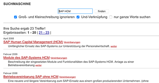 Man kann die Art der Suche verändern. Entfernt man das Häkchen in der Checkbox Und-Verknüpfung, so findet die Suchmaschine alle Dokumente, in denen mindestens eines der eingegebenen Suchbegriffe vorkommt (logische oder-Verknüpfung der Suchwörter).