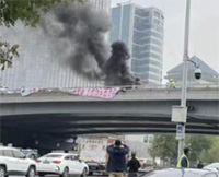 An der Sitong-Brücke in Peking hängte ein mutiger Demonstrant, verkleidet als Bauarbeiter, zwei Spruchbänder auf und zündete einen Autoreifen an, um Qualm für mehr Aufmerksamkeit zu erzielen. Der Wortlaut, frei übersetzt: